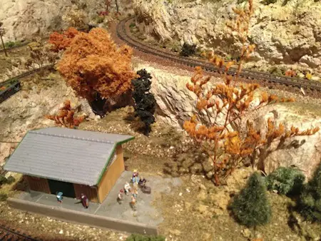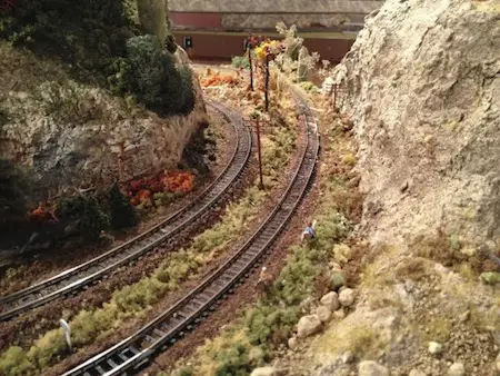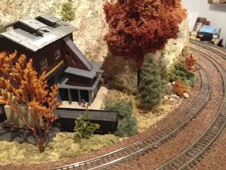 Sound-Deadening Roadbed Most of us have used cork or foam-type roadbeds to help deaden the sound and provide a smooth surface on which to lay tracks and ultimate run our trains. Another type of sound-deadening roadbed that can be used is a material called Aerotape. It can be found in the plumbing/insulation section of most hardware stores. This is a neoprene material that is simple to use, works well and is not very expensive. (This was highlighted in the April issue of Model Railroader by Joe Gill of Mimbres, MN. Short Tips ~ Variety is the rule when it comes to scenery. All the trees and bushes shouldn't be exactly the same color, shape and size. It's just not realistic. If you buy trees that are already made and are all the same color, try dipping each one in hot water for a variable period of time from 1-2 minutes to wash out some of the dye. You can also spray some of the trees with hairspray and sprinkle on some varying shades of ground foam to add different shades of color and different textures. ~ Another tip along the same line is that you can change the season from summer to fall fairly easily just by spraying the green trees with hairspray and sprinkling on varying shades of ground foam in fall colors - yellow, red, orange, etc. ~ Install some dark blue overhead lights in your train room that can be operated by a different switch (preferably a dimmer switch) than your regular lights. When your fast clock approaches evening hours, you can gradually dim the regular overhead lights and slowly increase the intensity of the blue lights. In full night mode, you will have a pleasing hue of moonlight under which to run your trains. ~ If you are trying to attach two pieces of wire together, consider using a metal rail joiner and solder the wires to each end of the rail joiner. You could even make a small electrical board by using a rectangular piece of wood or plastic, gluing down a row of rail joiners all parallel to each other and using them as wire connectors. You could actually create your own power distributor, or make wire connections any way you want by connecting some of the rail joiners to each other. You could really get organized and color code your connectors by painting them different colors (or label them with numbers or words)) that correlate with where the wires are going. (Model Railroader, March 2013 by Nathan Kimmel, Reading, PA) ~ Consider using kitty litter (preferably before using it as actual kitty litter) for desert-like ground cover. Mix in sifted sand or tan grout and glue it down with diluted white glue. Add some sparse bushes, cacti and static yellow grass. ~ Stack up some pieces of pine bark mulch on the layout to create a simulated shale rock retaining wall. Glue the pieces together. Then glue in some vegetation in the cracks between layers of the pine bark. You could even use some terrarium-type air plants ~ Use your imagination. Look at everything in your environment as something that you could potentially use to create a scene on your layout. Pine cones, pine-bark mulch, sand, gravel, cement, baseball dirt, black sifted dirt that you find around the development of new roads, gauze, mesh, sticks, branches, sage, carpet, corduroy, scrap plastic parts from old building kits, tin foil, nails, toothpicks, Q-tips, old newspaper, magazine ads. The list goes on and on. That's part of the fun - creating something out of nothing!