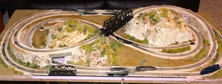 If you remember a few months ago, I mentioned that I was working on a small 2x4 foot, N-scale, "cookie-cutter" type layout using the cookie cutter method on a foam sheet instead of plywood. I thought I'd show a picture here of my progress so far. The roadbed, track and fine buff-colored ballast have been glued down, and some ground foam, lichen and small clump-foliage have been added. The tracks are wired with DC power, and the trains run well after cleaning and some minor troubleshooting. There are double railgaps separating the inner from the outer mainline to avoid polarity issues. I'll add an auto-reversing unit later so that trains will be able to run from one mainline to the other without difficulty. The turnouts aren't wired yet. I'm planning on adding some automated stops, starts and operating signals eventually. The track plan is basically a folded dog bone for the inner mainline and a simple oval for the outer mainline. When both trains are running, it provides a lot of opportunities for train "meets". I'll be adding a few structures and more trees and lots of other details before it's finished. This will make a great small layout for display anywhere in the home. It could be on a coffee table or just sitting on a display table. I let you know how this progresses in future editions of the newsletter.