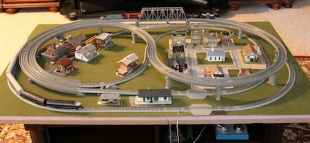 Startups Kato tracks are a great way to get started in model railroading. The tracks fit together flawlessly, which really reduces the risk of derailments. They can be purchased as individual pieces, and they also come in a variety of kits that can be combined to form any type of track plan that you want - from a simple oval up to a complicated double-twisted dog-bone, or anything in between, including viaducts, bridges and stations. You can get your trains up and running very quickly after laying the tracks. The scenery and details can be added at your leisure later, but at least you have trains running without a lot of hassle. They also sell DC transformers and built-up structures that can help reduce the startup time. Wiring is as easy as "plug-and-play", even for turnouts. As you get more sophisticated, you can always change to DCC later. And you can make it as large as you want by adding on more sections as time goes on. The following is a picture of a a small layout assembled with Kato tracks in fairly short order - mostly in one evening for the tracks and wiring. The structures took a while to build. About half of them shown here are kits that had to be assembled and painted and half are built-ups from Woodland Scenics. Many more details need to be added of course, like bushes, trees, roads, terrain modification, cars, people, etc. But it was fun getting everything up and running quickly. If you don't have the time or the patience for a layout that takes several years to create, this is for you!