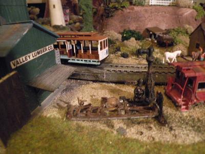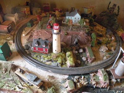 I built an HO train layout on a 6x6 foot section of thick plywood. My layout includes a working silver mine, a southwestern U.S.A.village, a wharf with boats, and a farm with house, barn, and sheds. Most of the structures are scratch-built buildings. To complete it I want to add lights for the structures, people figures, and more scenery. Right now, I'm just running a San Francisco-style streetcar which will have to do until I get a decent train set.