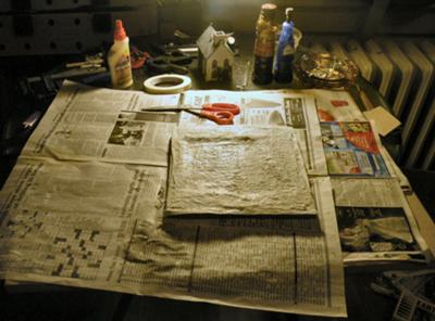 After planning the scene, I gathered all my materials, which I had purchased (HO scale church,tombstones,scenery materials, adhesives, etc.) at hobby shops, as well as materials I had convenient around my home (styrofoam, tape, newspaper, wooden veneer facing, etc.).